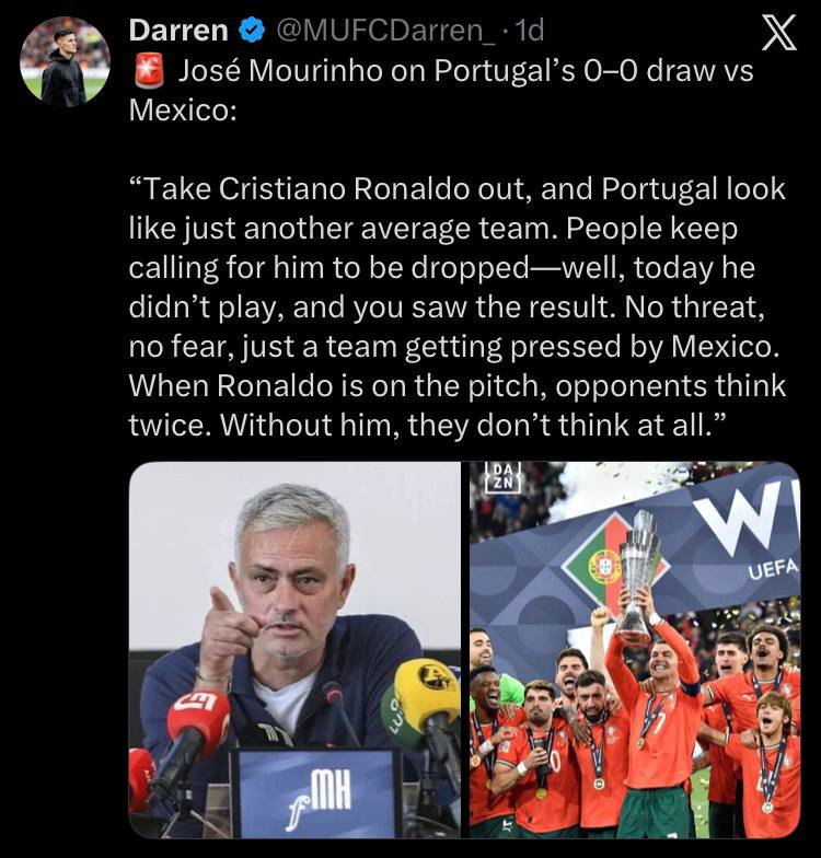 Melihat pada aksi tersebut pengurus bola sepak berpengaruh dunia, Jose Mourinho mengakui inilah kesannya jika Portugal mendengar kata ramai peminat untuk menyingkirkan Cristiano Ronaldo dengan lebih awal daripada bersama Portugal pada masa akan datang.