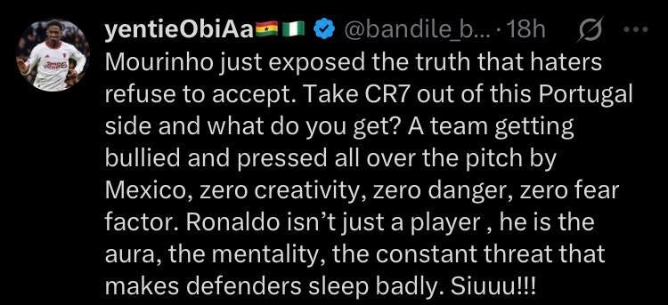 “Tiada ancaman, tiada aura hendak menakutkan lawan, cuma sebuah pasukan yang diberi tekanan oleh Mexico. Ianya berbeza jika Ronaldo beraksi. Lawan akan fikir dua kali. Tanpa beliau, lawan tak hiraukan langsung,” ujar beliau.