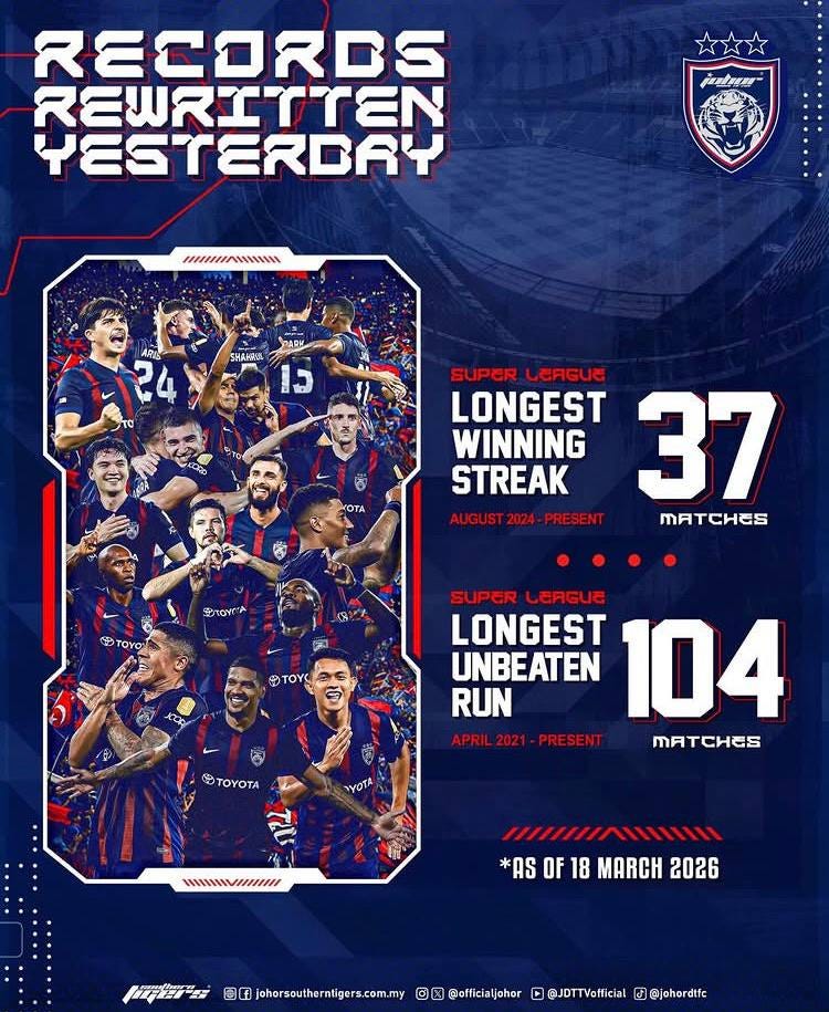 Untuk rekod, JDT kini telah merekodkan 104 perlawanan di pentas liga tanpa sebarang kekalahan, dan ianya menyamai pasukan dari Romania, Steaua Bucharest bagi tempat kedua.