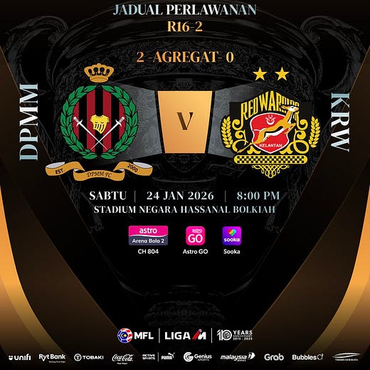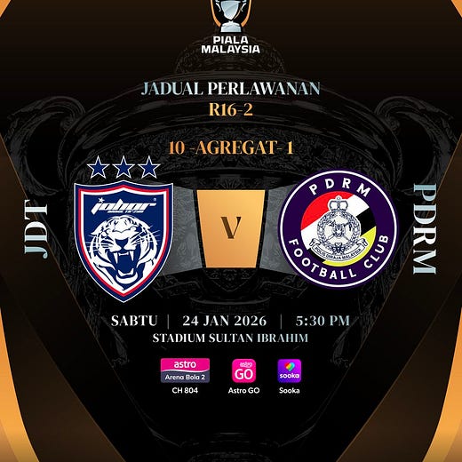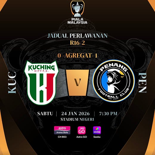 Saingan Piala Malaysia pusingan kedua 16 terbaik 2025/2026 hari ini diteruskan dengan pertemuan antara Kuching City dan Penang.