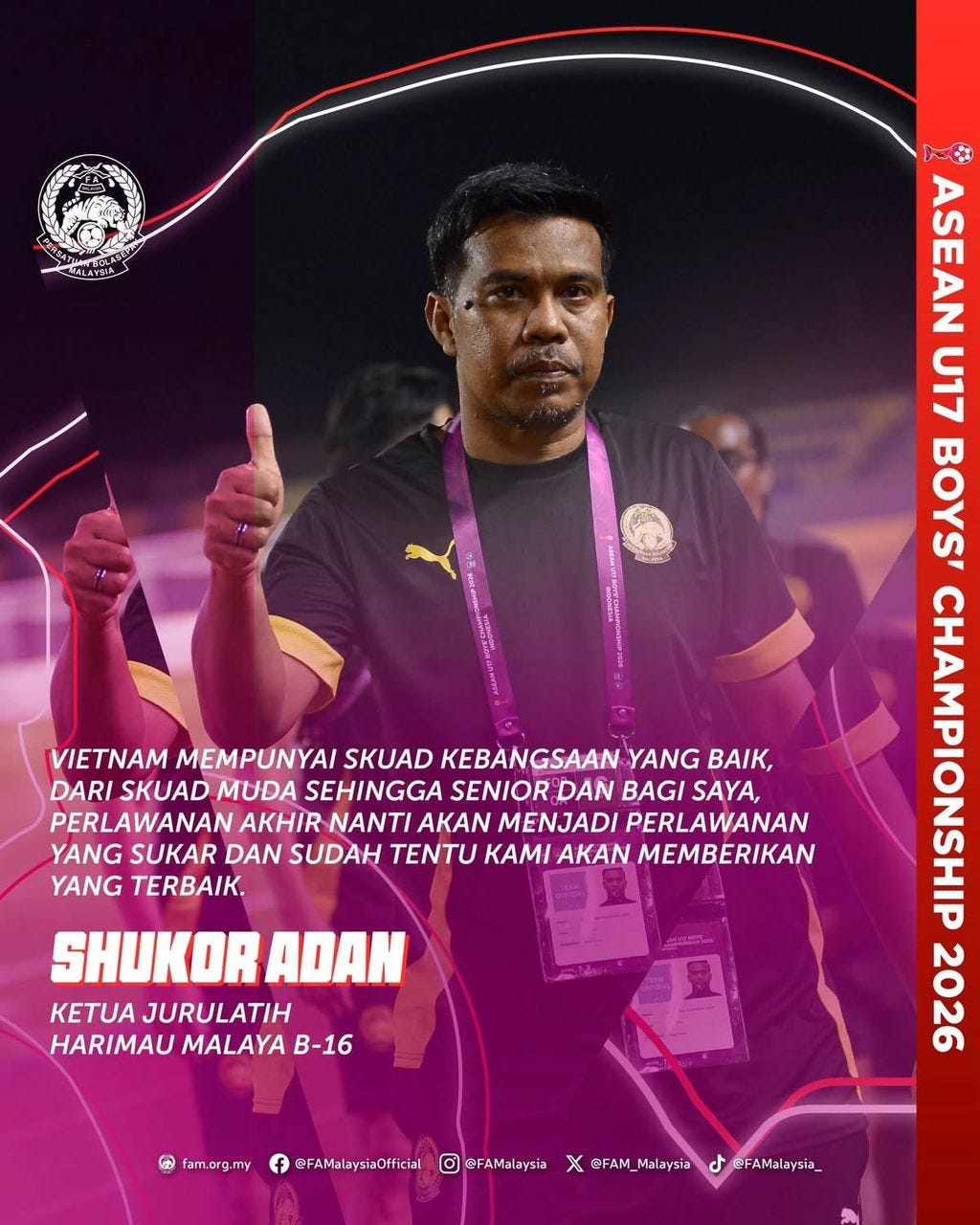 “Saya cuma mahu memberitahu kepada pemain untuk menikmati saat ini, sebab mereka membuat sejarah selaku pasukan termuda untuk melayakkan diri ke perlawanan akhir,” ujar Shukor.