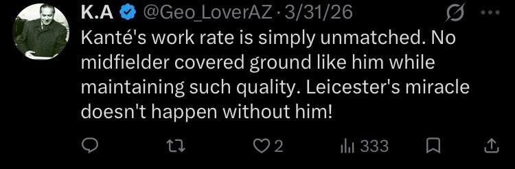 Dalam kalangan peminat, Kante kekal antara nama yang sentiasa disenangi mana-mana peminat ekoran kualiti permainan dan sikap dirinya merendah diri di luar padang.